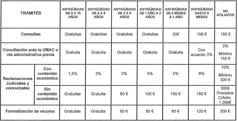 Todos los trámites son gratuitos para afiliados y afiliadas con más de 6 años de antigüedad ininterrumpida en el sindicato (salvo reclamaciones judiciales con contenido económico)